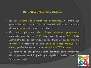 Joomla es un sistema de gestión de contenidos de código abierto que permite editar el contenido de un sitio web de manera sencilla. Se instala descomprimiendo el archivo en un directorio del servidor web y siguiendo 7 pasos: seleccionar idioma, comprobar requisitos, aceptar licencia, configurar base de datos, configurar FTP, configurar la instalación, y finalizar la instalación.