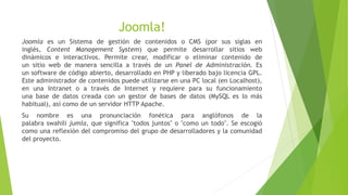Joomla es un sistema de gestión de contenidos de código abierto que permite crear sitios web dinámicos. Usa PHP y una base de datos MySQL para permitir a los usuarios agregar, modificar o eliminar contenido de manera sencilla a través de un panel de administración. El proyecto Joomla surgió en 2005 como una bifurcación del CMS Mambo y desde entonces ha lanzado varias versiones mejoradas para mejorar la seguridad y funcionalidad del sistema.