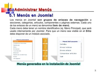 Este documento explica cómo administrar menús en Joomla, incluida la creación de nuevos menús y la publicación de ellos. Los menús en Joomla son grupos de enlaces de navegación. Para crear un nuevo menú, se usa el gestor de menús donde se ingresa un nombre y se guarda. Luego, el menú debe publicarse asociando el módulo correspondiente para que sea visible en el frontend. Dentro de cada menú se pueden crear ítems de menú que contienen enlaces anidados.