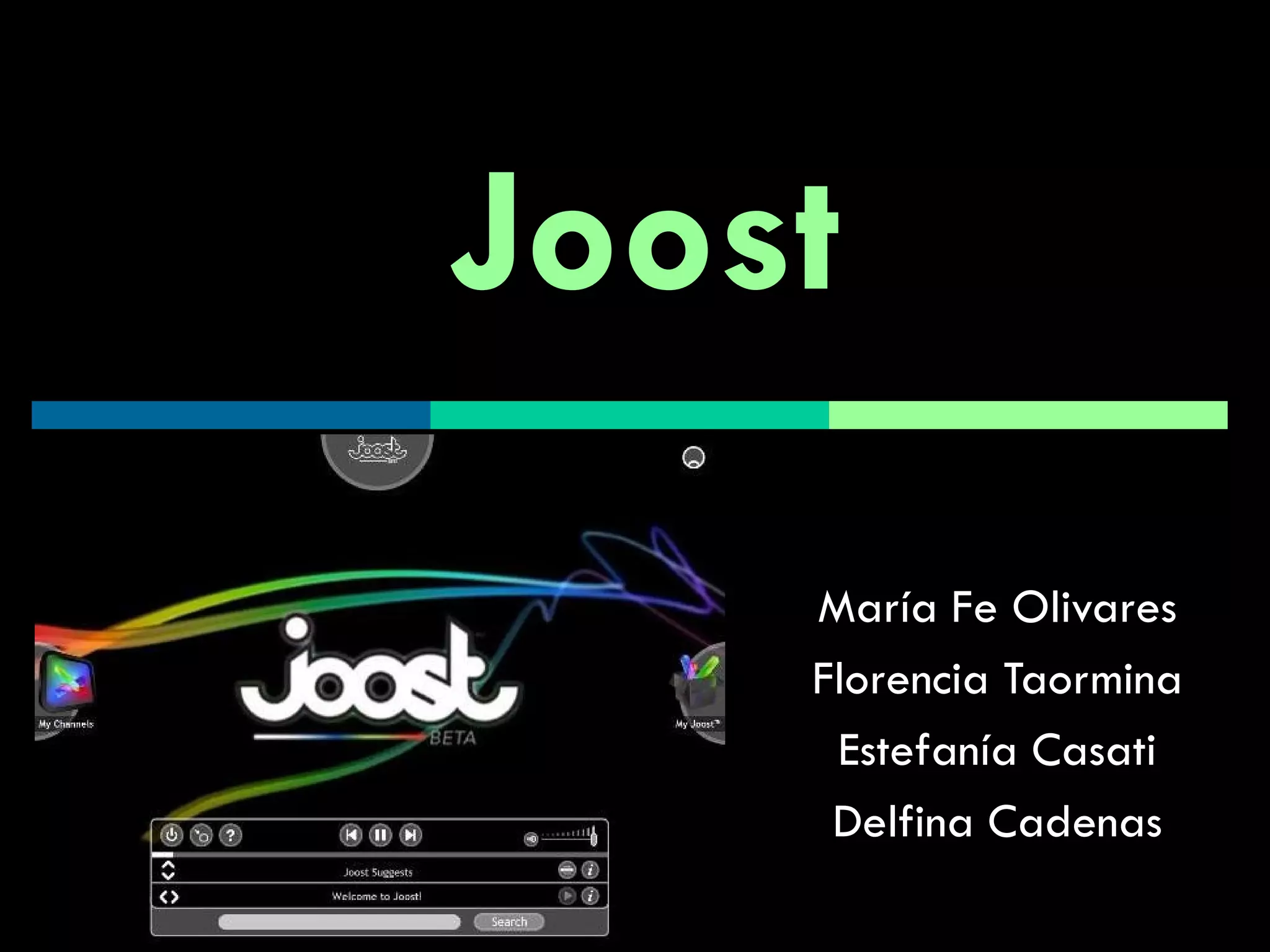 Joost es una plataforma para ver videos y escuchar música por Internet de forma gratuita e interactiva con otros usuarios. Fue creada por Niklas Zennstrom y Janus Friss, quienes también crearon Kazaa y Skype. Los usuarios pueden organizar el contenido en grupos por intereses o géneros y Joost se diferencia de sus competidores como Hulu y Livestation al permitir acceder a todo el contenido directamente desde el navegador sin necesidad de descargar un cliente de escritorio.