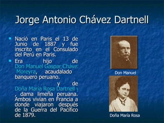 Jorge Chávez fue el primer aviador peruano. Nació en París en 1887 e hijo de padres peruanos. En 1910 obtuvo su licencia de piloto y batió récords de altura en vuelo. El 27 de septiembre de 1910 intentó cruzar los Alpes en su avión pero una ráfaga de viento derribó su aeronave cuando estaba por aterrizar, muriendo a los 24 años. Fue un pionero de la aviación en Perú y su memoria es honrada en su país.
