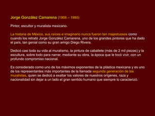 Jorge González Camarena (1908-1980) fue un destacado pintor, escultor y muralista mexicano, reconocido como uno de los máximos exponentes de la segunda generación de muralistas, cuya obra se centró en narrar la historia y cultura de México, enfatizando el humanismo y los valores nacionales. Su legado incluye importantes murales y pinturas que fusionan temas sociales y culturales, utilizando técnicas como fresco, mosaico y cerámica policromada. A lo largo de su vida, Camarena también exploró el arte comercial y popular, dejando un impacto significativo en la identidad artística de México.
