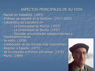 Jorge Guillén fue un poeta español nacido en 1893. Tuvo una destacada carrera académica como profesor de literatura en universidades de España, Francia y Estados Unidos. Su obra se caracteriza por la preocupación formal y está dividida en tres etapas. El poema "Las doce en el reloj" habla de la perfección del mundo a mediodía, cuando todos los elementos se encuentran en armonía. Guillén utiliza figuras como la personificación y metáforas en un estilo cuidado para alcanzar la poesía pura.