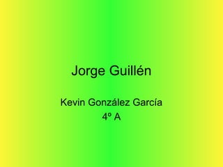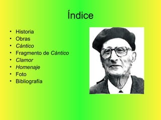 Este documento presenta la biografía y obra del poeta español Jorge Guillén. Dividió su obra principal en tres libros de poemas: Cántico, que exalta la armonía del cosmos; Clamor, donde explora el dolor y la muerte a raíz de la guerra civil; y Homenaje, que rinde tributo a figuras destacadas. El documento también incluye extractos de sus poemas y detalles sobre su vida y carrera.