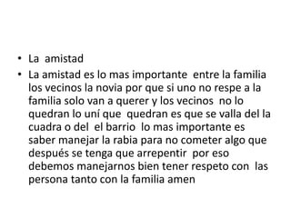 La amistad es lo más importante entre la familia, vecinos y pareja porque sin respeto por los demás, las personas sólo querrán aprovecharse y no aceptarán a alguien. Es crucial controlar la ira para evitar arrepentimientos y tener que irse del barrio, por lo que se debe tratar a todos con respeto.