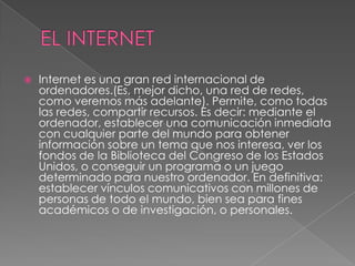 Internet es una red global de redes interconectadas que permite compartir recursos e información entre usuarios de todo el mundo. Se originó en la década de 1960 como ARPANET, una red gubernamental de los EE. UU. para proyectos de investigación, y ha crecido para incluir redes académicas, empresas y usuarios individuales. El protocolo TCP/IP permitió su expansión global y el desarrollo de la World Wide Web ha dado acceso a una gran cantidad de información en línea.