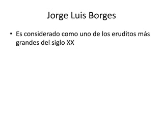 Jorge Luis Borges fue un escritor argentino nacido en 1899 en Buenos Aires, conocido por sus cuentos y poesías y considerado uno de los eruditos más grandes del siglo XX, aunque no descubrió nada por sí mismo.