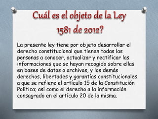 Este documento establece los objetivos de una ley para desarrollar el derecho constitucional de las personas a conocer, actualizar y rectificar información sobre ellas almacenada en bases de datos o archivos, así como otros derechos, libertades y garantías constitucionales relacionados con la privacidad personal y familiar, el buen nombre, y el derecho a recibir información veraz e imparcial.