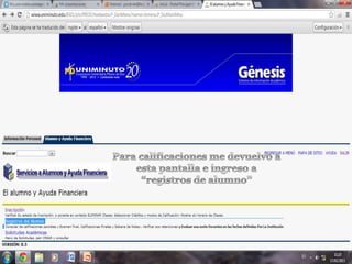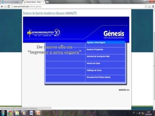 El documento describe las políticas de asistencia para estudiantes y cómo usar la plataforma estudiantil Genesis. Los estudiantes pueden perder hasta el 15% de las clases por fallas injustificadas y hasta el 25% por fallas justificadas si presentan un comprobante. Luego, el documento explica los pasos para ingresar a Genesis y revisar horarios, calificaciones y configuración personal.