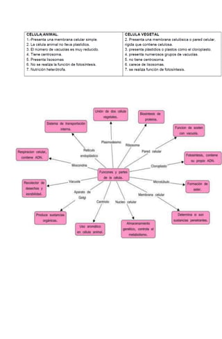 El documento presenta un plan de clases para una lección sobre la célula. El plan incluye la identificación de la clase, el enfoque pedagógico, los objetivos, indicadores, planeación de actividades y referentes teóricos. El objetivo principal es que los estudiantes describan la célula como una unidad estructural, funcional y reproductiva que constituye a los seres vivos. Las actividades incluyen presentar el objetivo, explorar conocimientos previos, desarrollar el tema a través de lectura y video, aplicar el