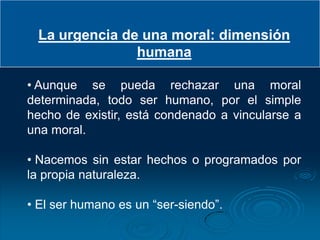 Este documento presenta diferentes enfoques morales cristianos como la patrística, escolástica, neoconservadora y de la liberación. Explica que el enfoque personalista pone al ser humano, considerado de manera integral y multidimensional, como el centro de la moral. Según este enfoque, la moral cristiana se basa en valores y principios como el deber, la dignidad humana y normas derivadas de leyes convertidas en deberes permanentes y obligatorios.