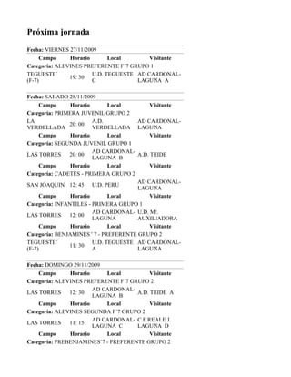 Este documento presenta la próxima jornada de varias categorías juveniles y juveniles de fútbol que tendrá lugar del viernes 27 al domingo 29 de noviembre de 2009 en diferentes campos. Se enumeran los partidos programados para cada día con la hora, localización, equipo local y visitante.