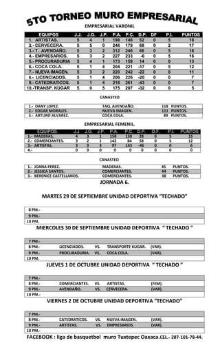 Este documento presenta los resultados de la sexta jornada de la liga de baloncesto de Tuxtepec, Oaxaca. En la rama varonil, Dany López de Taq. Avendaño lidera la tabla de anotadores individuales. La jornada 6 tendrá lugar del martes 29 de septiembre al viernes 2 de octubre en la Unidad Deportiva Techado y presenta partidos entre diferentes equipos como Artistas vs. Cervecera, Avendaño vs. Cervecera y Catedráticos vs. Nueva Imagen