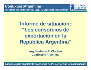 El documento describe la Asociación de Coordinadores de Grupos y Consorcios de Exportación de Argentina (ConExportArgentina). Explica que su objetivo es fomentar la asociatividad entre las pequeñas y medianas empresas para facilitar su entrada en los mercados internacionales. Actualmente hay alrededor de 80 consorcios y grupos de exportación en Argentina, aunque el marco legal no resuelve completamente cuestiones como su personería jurídica. ConExportArgentina busca promover esta forma de exportación colaborativa y mejorar las leyes relacionadas.