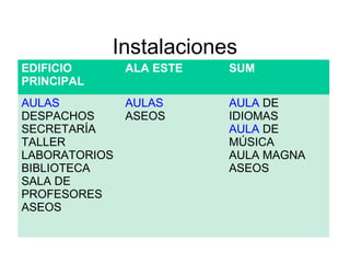 Este documento proporciona información sobre un instituto, incluyendo detalles sobre las instalaciones, el alumnado, profesorado y personal, el horario escolar, las clases, la evaluación y actividades extraescolares. Se describe la distribución de las aulas y otros espacios en el edificio principal, y se brindan datos como el número de estudiantes y profesores. También se explica el sistema de evaluación y promoción de cursos.