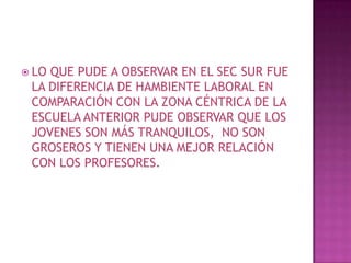 La jornada escolar en una secundaria comienza con un homenaje a la bandera nacional. Los estudiantes asisten a clases en diferentes salones y cambian de salón entre períodos para despejarse y concentrarse mejor. Los maestros son exigentes pero mantienen buen control de los estudiantes en un ambiente calmado, debido a la ubicación alejada de la ciudad con más áreas verdes.