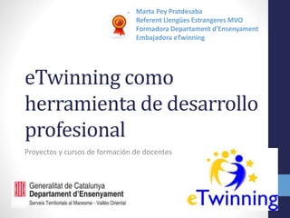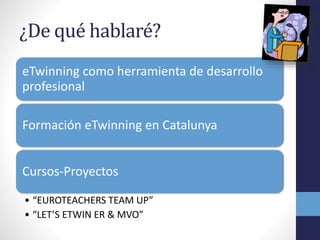 Este documento describe dos proyectos eTwinning de formación docente. El primero, "EUROTEACHERS TEAM UP", involucró a 17 profesores españoles y colaboradores de 8 países europeos para aprender sobre proyectos colaborativos de la UE. El segundo, "LET'S ETWIN ER & MVO", reunió a profesores italianos y catalanes para intercambiar experiencias sobre eTwinning a través de webinars y actividades colaborativas en línea. Ambos proyectos tuvieron como objetivo mejorar el desarrol