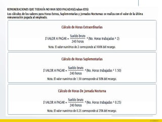El documento presenta información sobre las jornadas laborales, horas ordinarias, suplementarias y extraordinarias según el Código de Trabajo ecuatoriano. Describe los límites de las jornadas diarias y semanales, así como los recargos por horas suplementarias y extraordinarias. También cubre temas como descansos semanales, vacaciones anuales y días feriados.