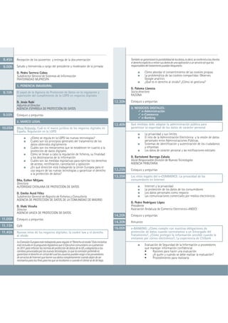El documento aborda las nuevas medidas europeas para garantizar la protección de datos en negocios digitales, destacando temas como la Ley de Protección de Datos (LOPD), el derecho al olvido y el uso de cookies. Se organiza una conferencia con expertos que discutirán el marco legal y las implicaciones de las nuevas tecnologías en la protección de datos. Además, se mencionan los retos asociados al comercio electrónico y al cloud computing en el contexto de la privacidad.