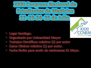 Este documento presenta el programa de un congreso de estudiantes de medicina que incluye sesiones sobre metodología de investigación y presentación de trabajos científicos. El congreso es patrocinado por una facultad de ciencias médicas y cuenta con la participación de doctores y becados de diferentes hospitales. El programa incluye temas sobre diseño de estudios, ética clínica, bioestadística y uso de buscadores médicos.
