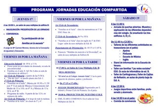Este resumen describe las intenciones y actividades principales de las Jornadas de Educación Compartida que se llevarán a cabo en el Colegio Antonio Gala. Las jornadas pretenden reflexionar sobre el papel de los padres en la educación, potenciar la participación familiar, dar a conocer el colegio a las familias, y estrechar lazos entre familias y profesorado. Las actividades incluyen conferencias, clases abiertas, talleres, juegos deportivos y una comida de convivencia.