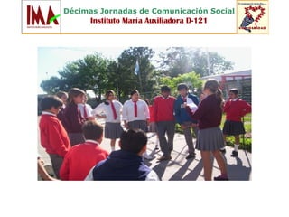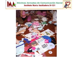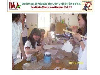El documento presenta el programa de las 10ma Jornadas de Comunicación Social que se llevarán a cabo en Chajarí, Entre Ríos, en octubre de 2006. El programa incluye talleres de teatro, títeres, propaganda y solidaridad, poesía visual y nutrición, así como charlas sobre solidaridad que serán dictadas en distintas instituciones educativas y culturales de la localidad.