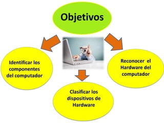 El documento clasifica los componentes del hardware de un computador en cuatro categorías: dispositivos de entrada, dispositivos de procesamiento, dispositivos de salida y dispositivos de almacenamiento. Identifica ejemplos de dispositivos como el mouse, la cámara digital y la impresora. El documento también incluye una actividad que instruye a los lectores a buscar un computador en una tienda en línea con ciertas especificaciones y características.