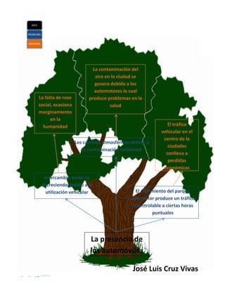 El documento discute varios efectos negativos de la contaminación del aire y el tráfico vehicular en las ciudades, incluyendo problemas de salud debido a la contaminación del aire generada por los automóviles, pérdidas económicas asociadas con el tráfico vehicular en el centro de las ciudades, y una disminución en el intercambio social debido al uso creciente de vehículos. También menciona que el crecimiento del parque automotor produce tráfico excesivo en horas pico.