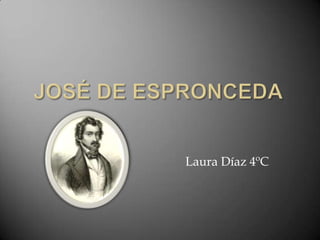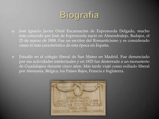 José de Espronceda fue un escritor español del Romanticismo. Nació en 1808 y estudió en Madrid, donde fue desterrado por cinco años debido a sus actividades intelectuales. Viajó por Europa y conoció a Teresa Mancha en Portugal, de quien se enamoró. A su regreso a España se dedicó a la política y periodismo. Murió en 1842 a los 34 años. Escribió obras influenciadas por el Romanticismo como El estudiante de Salamanca, El diablo mundo y poesías como El cosaco.