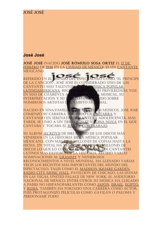 José José es un cantante mexicano conocido como "el Príncipe de la Canción". Comenzó su carrera musical en la adolescencia cantando en serenatas. Su álbum Secretos de 1983 es uno de los discos más vendidos en la historia de la música popular mexicana, con más de 11 millones de copias. A lo largo de su carrera de más de 49 años ha vendido más de 80 millones de discos y recibido numerosos premios y reconocimientos.