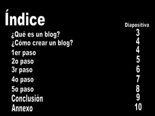 Este documento explica los 5 pasos para crear un blog en blogger.com. 1) Crear una cuenta de Gmail si no se tiene. 2) Acceder a blogger.com y crear el blog completando los datos requeridos. 3) Publicar la primera entrada en el nuevo blog. Luego permite configurar aspectos como publicación, formato y comentarios.