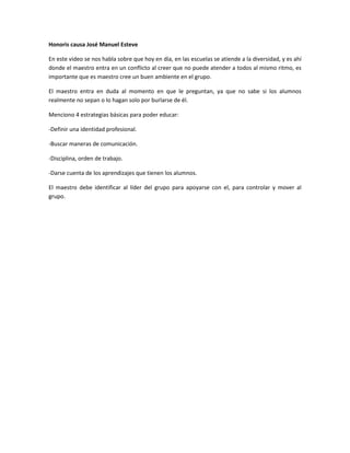 El documento presenta 4 estrategias básicas para que los maestros puedan educar a estudiantes en un ambiente de diversidad: 1) definir una identidad profesional, 2) buscar maneras de comunicación efectiva, 3) mantener disciplina y orden en el trabajo, y 4) estar atento a los aprendizajes de los estudiantes. También enfatiza la importancia de que los maestros identifiquen a los líderes del grupo para obtener su apoyo en el manejo del salón.