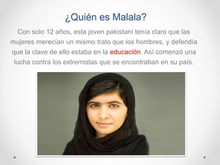 Malala Yousafzai es una activista paquistaní que a los 12 años comenzó a defender públicamente el derecho de las niñas a recibir educación, desafiando a los talibanes. Los talibanes la atacaron por sus opiniones, disparándole en la cabeza en un autobús, pero sobrevivió y continuó su lucha. Recibió el Premio Nobel de la Paz en 2014 a los 17 años por su defensa de los derechos de los niños, convirtiéndose en la persona más joven en recibir este premio.