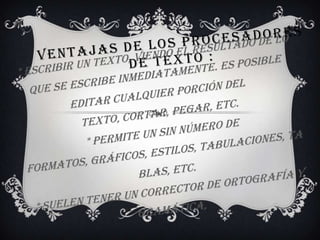 El documento describe los principales elementos que componen un procesador de textos avanzado, como la herramienta de ortografía, formatos de texto, márgenes, tablas, gráficos, y cómo se guardan, imprimen y obtienen ayuda los documentos. También explica cómo agregar tablas, recuadros, fórmulas y dibujos a los documentos.
