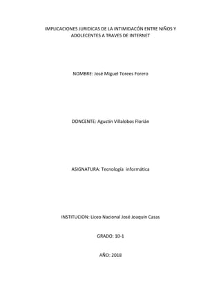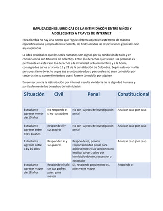 Este documento discute las implicaciones jurídicas de la intimidación entre niños y adolescentes a través de Internet. Explica que aunque no hay una norma específica en Colombia, se aplican disposiciones generales para proteger los derechos a la intimidad, el buen nombre y la honra. También analiza las responsabilidades civiles, penales y constitucionales de los agresores en función de su edad.