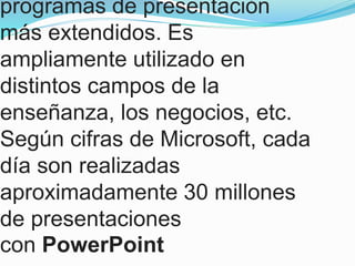 PowerPoint es uno de los programas de presentación más utilizados. Se usa ampliamente en la educación y los negocios, y según Microsoft se realizan aproximadamente 30 millones de presentaciones diarias con PowerPoint. El documento también describe algunas diferencias entre PowerPoint en línea y la versión de escritorio, así como breves definiciones y ejemplos de diferentes tipos de virus informáticos como bombas de tiempo, gusanos, troyanos, secuestradores de navegador, keyloggers y máquinas zombie.
