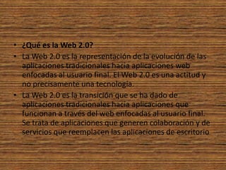El documento describe la Web 2.0 como la evolución de las aplicaciones tradicionales a aplicaciones web enfocadas en el usuario final que fomentan la colaboración y reemplazan las aplicaciones de escritorio. Explica que el término Web 2.0 fue acuñado por Dale Dougherty en una conferencia en 2001 para referirse al renacimiento y evolución de la web, la cual había cambiado de una versión estática a una más interactiva. También menciona que aunque no existe una receta única, tecnologías como las APIs y pl
