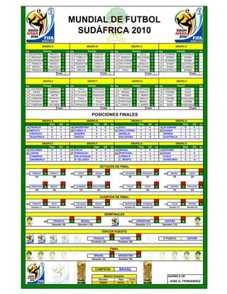 El documento presenta los resultados del Mundial de Fútbol de Sudáfrica 2010, incluyendo la tabla de posiciones de los 8 grupos, los cruces de octavos, cuartos y semifinales, el partido por el tercer puesto y la final. Brasil se consagró campeón al vencer 2-1 a Argentina en la final.