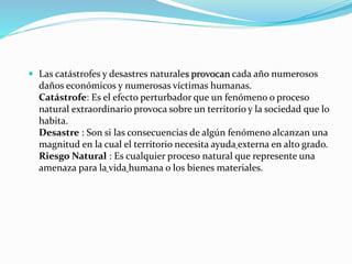 El documento describe diferentes tipos de riesgos naturales como catástrofes, desastres y riesgos derivados de la dinámica interna y externa de la Tierra. También discute cómo los factores humanos como el crecimiento urbano descontrolado, el cambio climático, la deforestación y la sobreexplotación de recursos incrementan la vulnerabilidad a estos riesgos. Finalmente, detalla los impactos del cambio climático, como el aumento de temperaturas y niveles del mar, y los problemas relacionados con la deforestación, la