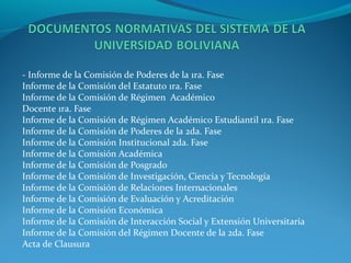 El documento describe la estructura organizativa del sistema universitario y contiene informes de varias comisiones de la primera y segunda fase sobre temas como poderes, estatuto, régimen académico docente y estudiantil, institucional, académico, posgrado, investigación, relaciones internacionales, evaluación y acreditación, económico, interacción social y extensión universitaria, y régimen docente. También incluye la misión, visión y estructura organizativa de la Universidad Mayor de San Andrés.