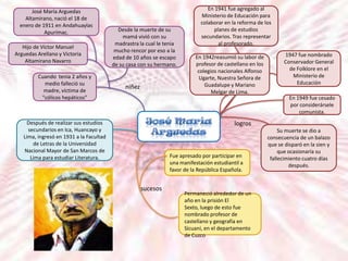 El documento resume la vida y logros de José María Arguedas, escritor peruano. Arguedas nació en 1911 en Perú y perdió a su madre a los 2 años y medio. Estudió literatura en la Universidad Nacional Mayor de San Marcos y trabajó como profesor. Fue agregado al Ministerio de Educación para reformar planes de estudio y nombrado Conservador General de Folklore. Murió en 1969 tras dispararse en la sien.