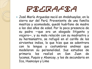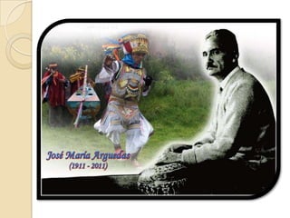 José María Arguedas nació en Perú en una familia mestiza y quedó huérfano a una edad temprana. Se refugió en la lengua y costumbres andinas aprendidas de los sirvientes indígenas. Escribió varias obras literarias que reflejan su experiencia creciendo entre culturas andinas y occidentales. Finalmente, agobiado por conflictos emocionales, se suicidó en 1969.