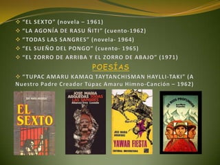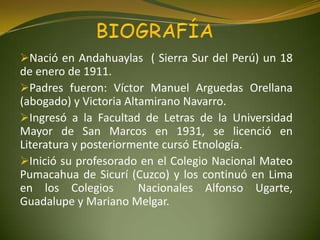 Este documento describe la vida y obra del escritor peruano José María Arguedas. Nació en 1911 en Perú y se dedicó a la literatura, poesía, antropología y la educación. Fue profesor universitario y director de museos. Sus obras más importantes exploraron la cultura quechua y el mestizaje cultural en Perú. Su pensamiento pedagógico promovió el diálogo intercultural y la defensa del patrimonio cultural a través de la educación.