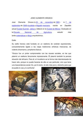 José María Velasco fue un pintor mexicano nacido en 1840 que se destacó por sus paisajes que buscaban exaltar la naturaleza. José Clemente Orozco fue un muralista mexicano nacido en 1883 conocido por su estilo heroico de realismo expresionista. Diego Rivera fue un pintor muralista mexicano nacido en 1886 comprometido con el socialismo y fundador del Partido Comunista Mexicano.