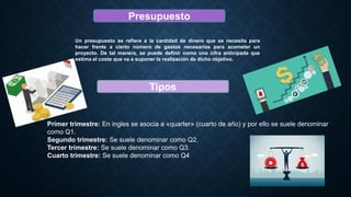 El documento habla sobre presupuestos. Explica que un presupuesto es una estimación de los costos necesarios para llevar a cabo un proyecto. Luego describe diferentes tipos de costos como costos fijos, variables y semivariables. También ofrece consejos sobre cómo hacer un presupuesto efectivo como preparar materiales, clasificar gastos y revisar el presupuesto periódicamente.