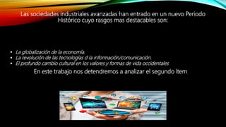El documento analiza los efectos sociales y culturales de los medios de comunicación y sus implicaciones educativas. Describe cómo los medios han llevado a una homogeneización cultural global y una mercantilización de la cultura. También explica que los medios no son simples transmisores de información sino que representan la realidad desde una perspectiva particular. Finalmente, propone que la educación debe enseñar sobre los medios de forma integral para formar estudiantes críticos y conscientes.