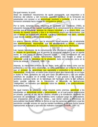La educación virtual se ha convertido en una opción que las instituciones educativas empiezan a explorar. Ofrece la posibilidad de una educación global sin limitaciones de espacio o acceso local al conocimiento. Para que sea efectiva, se debe centrar en la responsabilidad del estudiante y el aprendizaje colaborativo a través de redes. También requiere el desarrollo de estrategias metacognitivas por parte del estudiante.