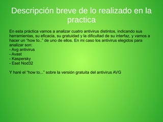 El documento describe cuatro antivirus analizados: AVG, Avast, Kaspersky y Eset Nod32. Incluye una guía paso a paso de cómo instalar y usar la versión gratuita de AVG. Explica que AVG tiene una interfaz sencilla y versiones gratuita y de pago, mientras que Avast es uno de los mejores antivirus gratuitos con varias herramientas de protección. También señala que Kaspersky es galardonado por su protección contra diversas amenazas y que Eset Nod32 ofrece antivirus y antispy