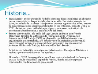 El SENA es la entidad nacional encargada de ofrecer formación profesional en Colombia para contribuir al desarrollo del país. Fue creado en 1957 por Rodolfo Martínez Tono y ofrece programas en 33 regionales y 17 centros de formación en Bogotá en áreas como construcción, electricidad, industria y salud.