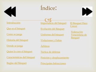 El documento resume las características y reglas básicas del baloncesto. Fue creado en 1891 por James Naismith en Estados Unidos. Se juega entre dos equipos de cinco jugadores cada uno, con el objetivo de encestar una pelota en un aro elevado. Existen reglas como los tiempos de juego, faltas, violaciones y árbitros que dirigen el partido.